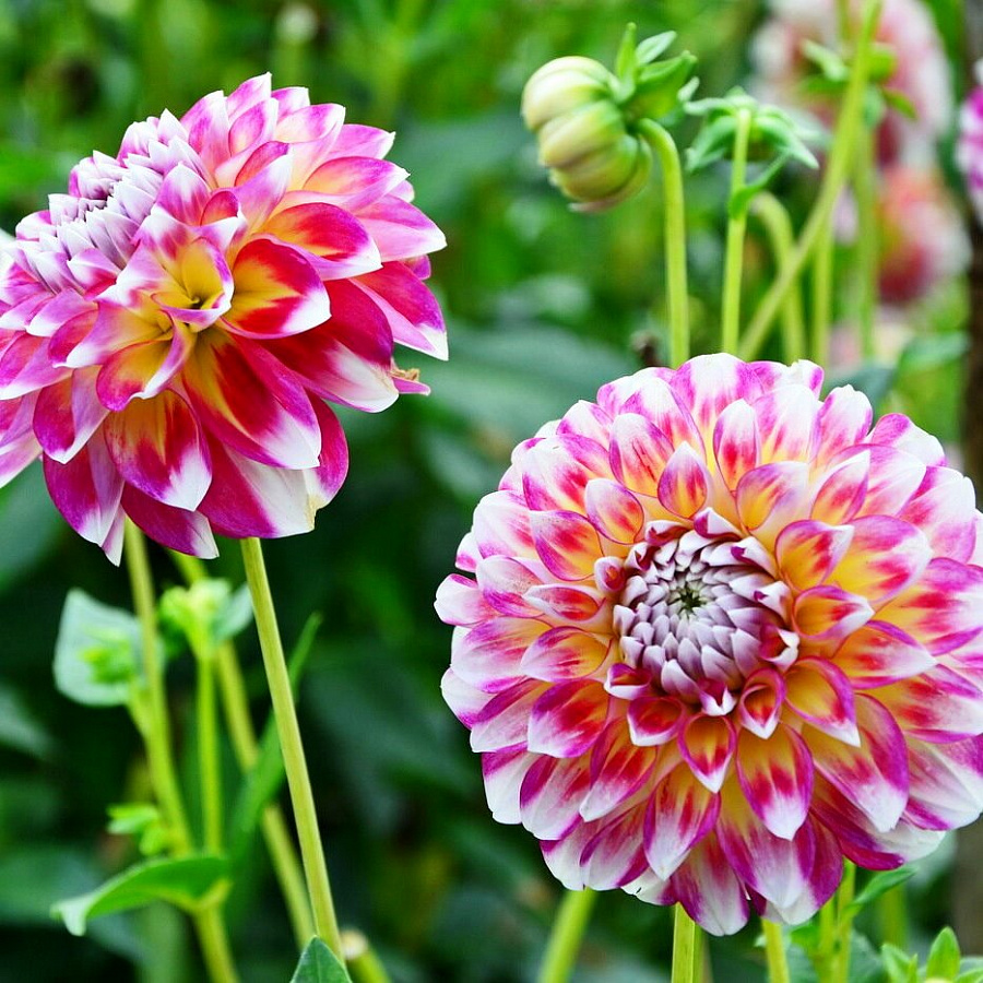 Луковицы георгины махровой Хавеи (Dáhlia variabilis Hawaii) для украшения своих приусадебных участков настоятельно советуют приобрести ландшафтные дизайнеры. С июля до октября это будет частичка ярких Гавайев на вашем участке. Этот сорт исключительно декоративен. Высокий, до 100 сантиметров, куст состоит из нескольких прямостоячих побегов, которые довольно быстро растут. Георгина Hawaii издалека будет привлекать всеобщее внимание крупными, пестрыми шаровидными цветами. Окраска цветочных корзинок удивительная: основание лепестков имеет лимонный цвет, его сменяет малиновый, кончики окрашены бело-ванильным.