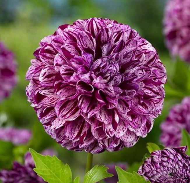 Луковицы георгины махровой Марбл Болл (Marble Ball, DÁHLIA VARIABILIS) дарят жизнь цветку, красоту которого сложно передать словами. Царское растение насыщенного фиолетового цвета по краям с белым отливом. Каждый лепесток свернут в трубочку, формируя пышный бутон. Цветет непрерывно с июня по сентябрь. Куст высотой от 60 до 100 сантиметров усыпан крупными бутонами до 12 сантиметров в диаметре. Аромат приятный, но слабый. Каждый бутон радует свежестью около 20 дней, после него появляются другие, не менее привлекательные. Любит хорошо удобренную почву, солнце, отсутствие ветра.