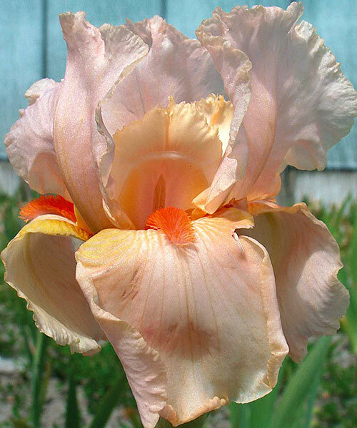 • листва сохраняет свой сочный цвет на протяжении всего лета. Семена этого сорта тяжело прорастают, поэтому растение рекомендуется размножать вегетативно. Бутоны имеют персиково-розовый оттенок с мандариновой бородкой. Лепестки немного волнистые, придают цветку особое изящество. Прекрасно смотрится в сочетании с боле темными оттенками цветков на групповых клумбах и в подарочных букетах.