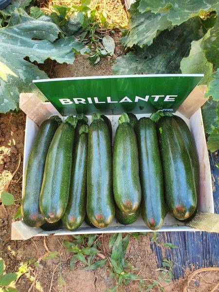Семена кабачка "Бриллиант" (Brilliant) – очень популярный сорт в силу своей выносливости к переувлажнению и недостаточному увлажнению почвы, и отличным товарным характеристикам. Культура плодоносит по истечении 40 дней после первых всходов. За сезон один куст может дать до 20 кабачков. Плоды отличаются цилиндрической формой и длиной до 22 см. Средняя масса составляет до 1 кг. Окраска урожая темно-зеленая с частыми полосами и пятнами по всей длине, кожица тонкая. Под ней находится крепкая белая мякоть с эллиптическими семенами бежевого цвета внутри. Сорт прекрасно переносит транспортировку и хорошо хранится.
