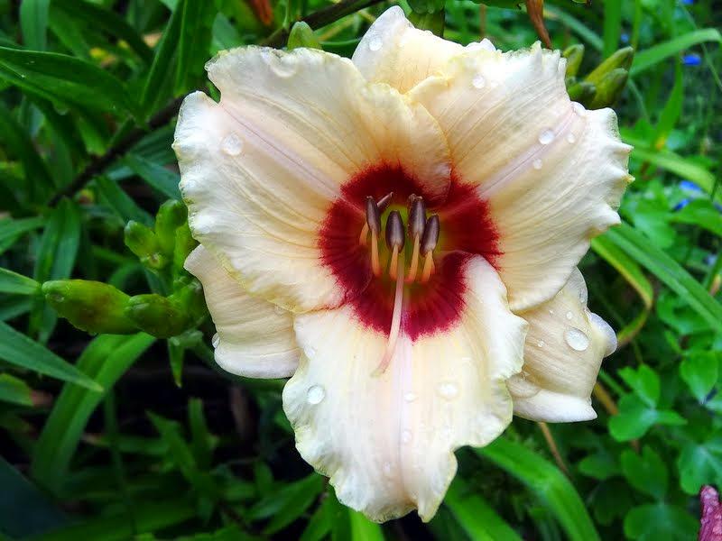 Окраска цветка : Кремово-розовая с розово-красным глазом и зеленым горлом